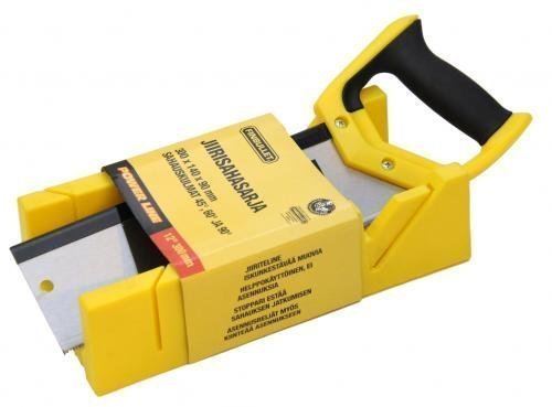 Jiirisaha 300×140×90mm. Sahauskulmat 45°, 60° ja 90°. – Jiiriteline iskunkestävää muovia. – Helppokäyttöinen, ei asennuksia. – Stoppari estää sahauksen jatkumisen. – Asennusreijät myös kiinteää asennukseen