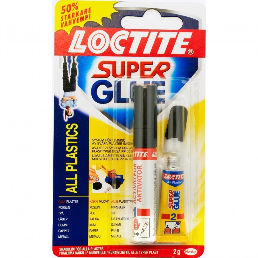 Supertehokas muoviliima. . Sopii erityisen hyvin vaikeasti liimautuville muoveille, kuten vinyylille, nailonille ja pleksille. Ihanteellinen liima esim. muovilelujen, matkapuhelimien yms. korjaamiseen. Muodostaa näkymättömän liimasauman.