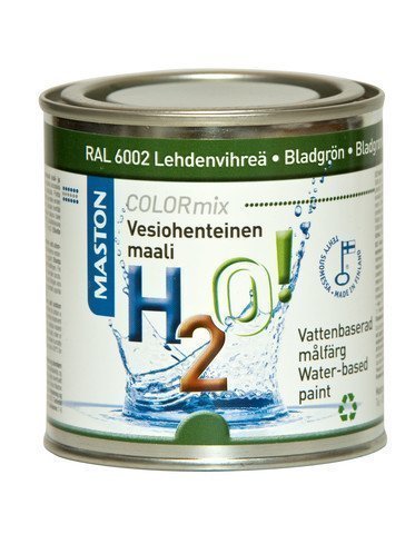 Maston COLOR mix H2O! – erittäin nopeasti kuivuva, akrylaattipohjainen, vesiohenteinen pintamaali sisä- ja ulkokäyttöön. Soveltuu puu- ja metallipinnoille. Näin onnistut!. Pitkäikäisen ja kestävän pinnan takaamiseksi noudata seuraavia ohjeita. Puhdista käsiteltävä pinta huolellisesti rasvasta ja liasta. Epätasainen pinta on hiottava ennen työn aloitusta. Poista hiontapöly huolellisesti. Sekoita maali hyvin ennen käyttöä! Kokeile tuotteen soveltuvuus aikaisemmin käsitellylle pinnalle ennen pintakäsittelyä. Ulkokäytössä metallille maalattaessa on käytettävä Maston H2O! Primer – siveltävää pohjamaalia. Voidaan levittää siveltimellä, telalla tai ruiskulla. Ohennus ja työvälineiden pesu: vesi (haalea). Maalaustyön ja maalin kuivumisen aikana tulee ilman, pinnan ja maalin lämpötilan olla yli +15°C ja ilman suhteellisen kosteuden alle 80%. Kuivumisajat (+20°C): käsittelykuiva 1 h. Paras lopputulos saadaan, kun kuivaus tapahtuu korotetussa lämpötilassa +50°C/30 min. Riittoisuus: 7-8 m2/l. Etiketin värisävy on viitteellinen.
