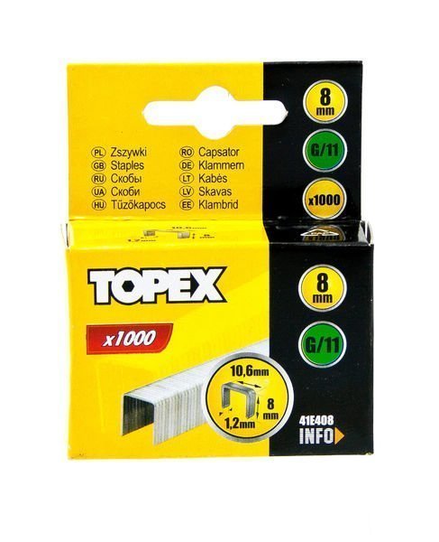 Niitin tyyppi. G/11. Niitin korkeus. 8 mm. Niitin paksuus. 1,2 mm. Niitin leveys. 10,6 mm. Yhteensopivuudet. Arrow. ET 50 / ETN 50 / ETL 50 / HT 50 / T 50 / T 55. Esco. Compacta 530 / N 530 / C 530. KWB. HT 057. Markwell. L 3, MH 3 3. Mekano. Hyper 16 / Super 17. Novus. J-19 EHG , J-030 G. Rapid. 11, 132, 14, 24, 34, 54. Rocafix. MS 50 V. Topex. 41E910, 41E911.