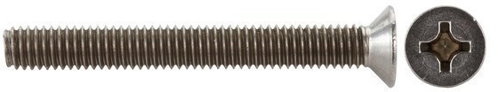 ruostumaton teräs A2 / AISI 304. – DIN 965 uppokanta, Phillips. – lujuusluokka A2-70. – kierre (d) M4 × 0,7. – pituus (L) 16 mm. – avainkoko (PH) PH2. – kannan halkaisija (dk) 7,5 mm. – kannan korkeus (k) max. 2,2 mm. – 20 kpl / pakkaus
